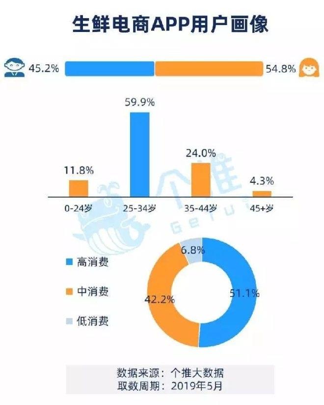 個推大數據近日推出《生鮮電商APP數據報告》(取數周期從2018面1額到2019年5月),有近5成手機用戶已經下載了各類生鮮APP,年輕的中等收入女性是最活躍的用戶。