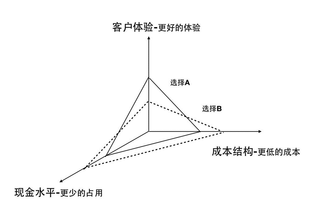 從每一個單一維度來看,三個維度都有各自的最優方向,客戶越滿意越好,成本越低越好,現金占用越少越好。但現實中,短期內這三個維度之間互相影響,甚至互相排斥。