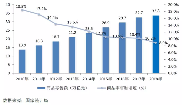 圖/2010-2018年我國商品零售額及增速