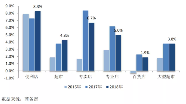 《報告》顯示,截至2018年底我國零售業經營單位2080萬個,同比增長7.8%,增速比上年加快0.9個百分點。