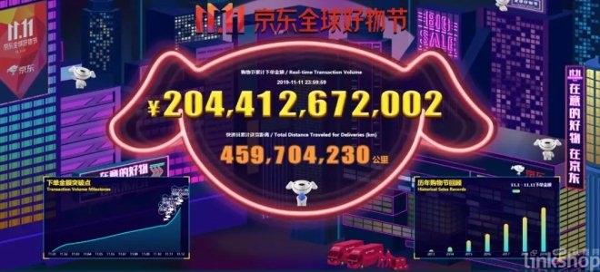 截至11月12日0時,京東雙11累計下單金額為2044億元。