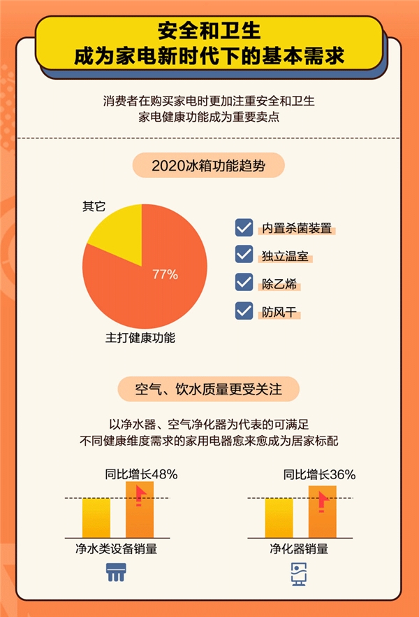 什么值得買數(shù)據(jù)顯示,消費(fèi)者在購買家電時(shí)更加注重安全和衛(wèi)生,健康功能已成為家電最重要賣點(diǎn)。以冰箱為例,“雙11”期間,主打健康安全功能的冰箱,在冰箱總銷量中占比高達(dá)77%。而以凈水器、空氣凈化器為代表的、可滿足不同健康維度需求的家用電器,愈來愈而成為居家標(biāo)配,二者的銷量分別同比增長48%和36%。并且,智能家居尤其是全屋智能化家居解決方案,正在成為新趨勢。