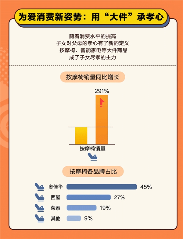 數(shù)據(jù)顯示,2020年,子女對父母的孝心有了新的定義,按摩椅、智能家電等“大件商品”,成為子女“孝心消費(fèi)”的代表性產(chǎn)品,其中,按摩椅的銷量同比大增291%。而為每個(gè)家庭的幸福生活提供堅(jiān)實(shí)保障的煙機(jī)灶具、烤箱,銷量分別同比大增175%、99%。