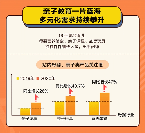 親子教育,則是家庭消費(fèi)的另一種重要內(nèi)容,并且,90后父母表現(xiàn)出明顯的“氪金育兒”傾向,母嬰營養(yǎng)輔食、親子課程、益智玩具等等,細(xì)致入微,消費(fèi)選擇日益多元。其中,營養(yǎng)輔食、親子玩具、親子課程,銷量分別同比增長47%、43.7%和26%。此外,舉家出游也成為消費(fèi)者熱選,親子樂園景區(qū)度假廣受歡迎。