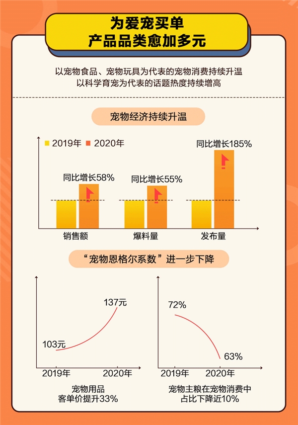 “雙11”期間,寵物用品銷售額同比增長58%,而客單價(jià)則從2019年103元增長至2020年的137元,增幅33%,不過,寵物主糧在寵物消費(fèi)中的占比卻下降了近10%。