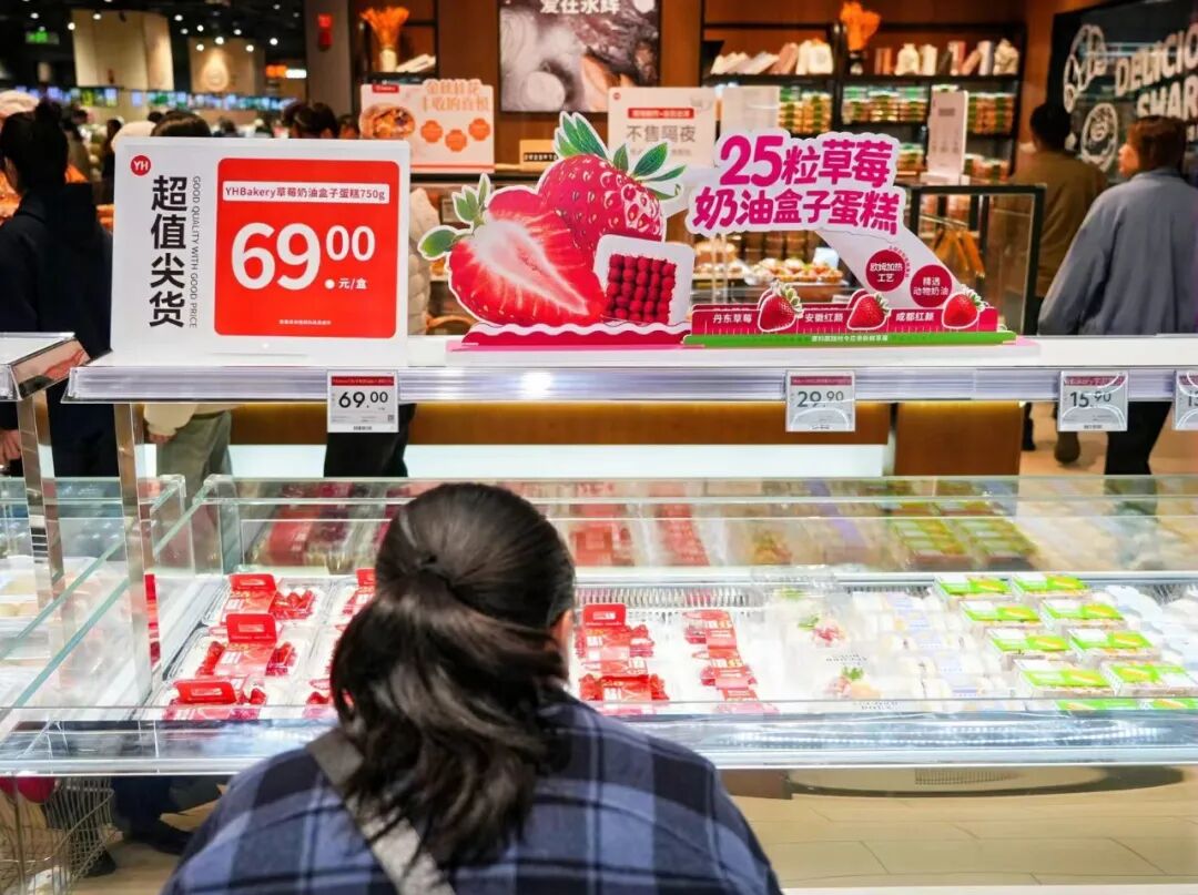 與此同時,來自丹東、成都等產區的草莓也如期上架,成為冬日水果區的亮點。與之呼應,烘焙區域的明星單品“草莓奶油盒子蛋糕”也受到廣泛關注。這款產品以整盒包含25顆紅顏草莓為特色,搭配MONIN專屬定制草莓果醬,口感層次豐富,成為連接時令鮮果與烘焙甜點的暢銷商品。