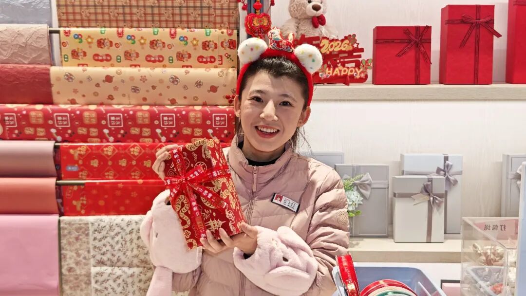 永輝北京魯谷店的禮盒專區,一位年輕顧客正在仔細比較兩款堅果禮盒。她最終選擇了永輝與森寶聯名的“駿馬獻瑞”禮盒,“設計有年味,品牌也熟悉,價格很合適”。不遠處的服務臺前,工作人員正熟練地為顧客選購的草莓和車厘子進行禮品包裝。紅色禮盒配上金色絲帶,旁邊還有一張手寫的祝福卡片——這是永輝今年新增的“手寫祝福”服務,讓標準化商品多了份人情溫度。