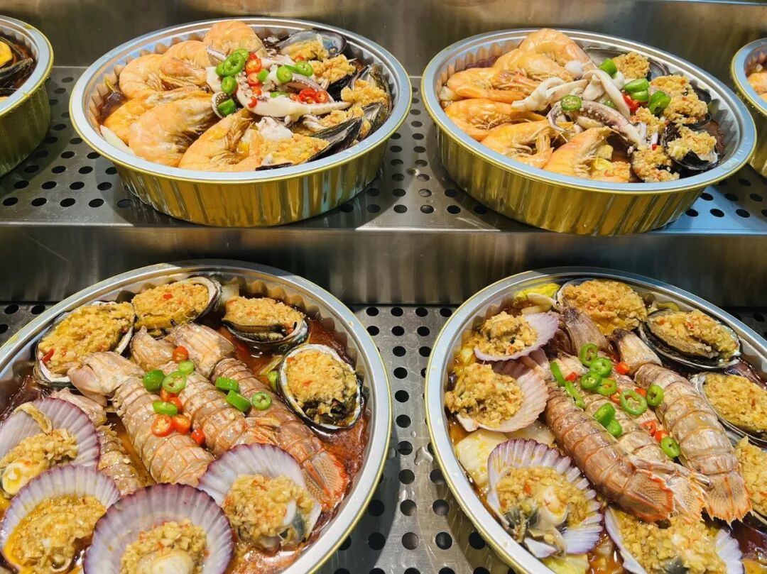 尤為值得關(guān)注的是永輝在海鮮消費場景上所做的創(chuàng)新體驗。現(xiàn)場制售的“海鮮家庭分享桶”與“元氣蒸”項目形成了巧妙的風味互補。一邊是現(xiàn)場加工、熱辣馥郁的分享大菜,選用波士頓龍蝦、小青龍等鮮活食材;另一邊則是即時蒸煮、鎖住原味的貝類與蝦蟹,主打食材的本真鮮甜。這種“現(xiàn)制熱出、即選即享”的模式,將后廚的鍋氣與煙火感直接傳遞至賣場,讓海鮮消費從靜態(tài)選購轉(zhuǎn)變?yōu)閯討B(tài)體驗,為家庭餐桌提供了一個新鮮、熱鬧且充滿儀式感的選擇。