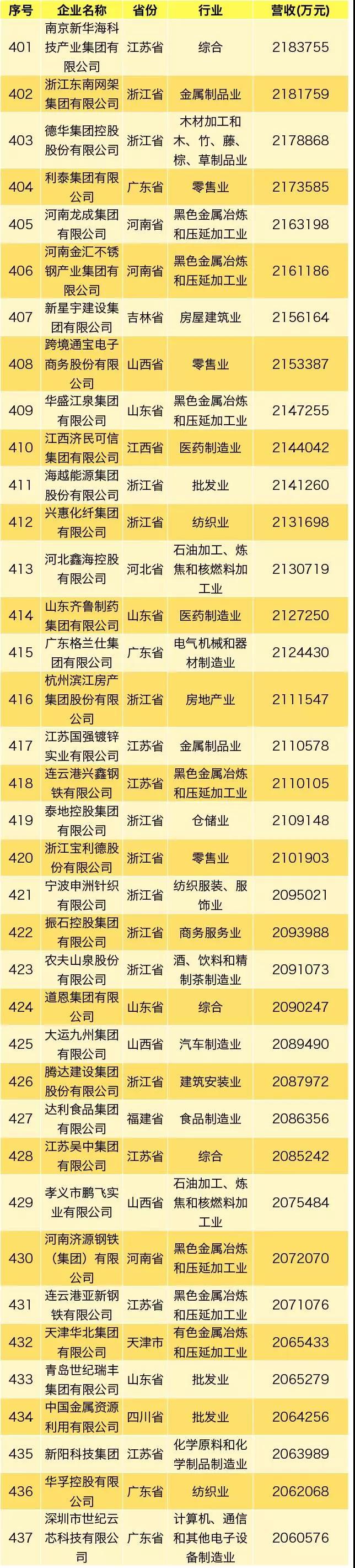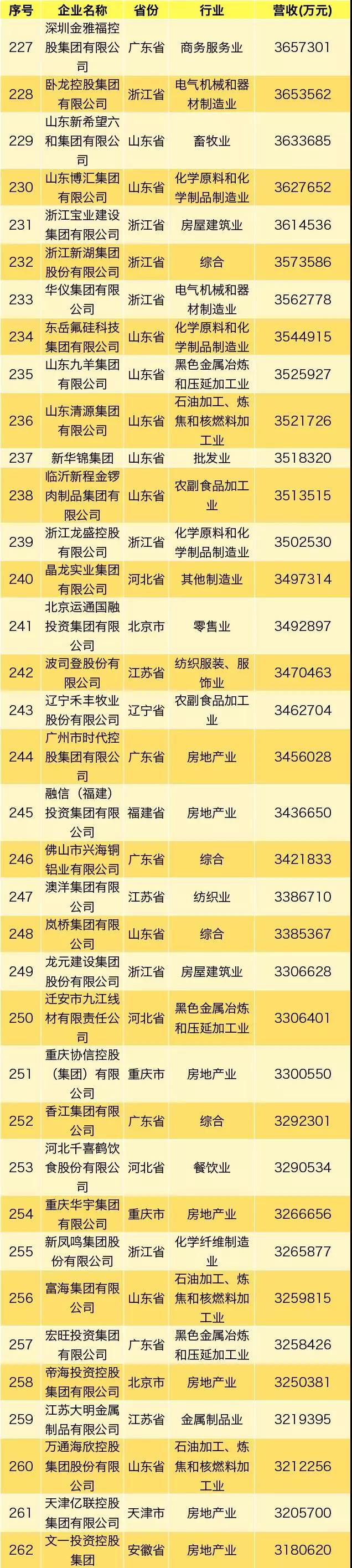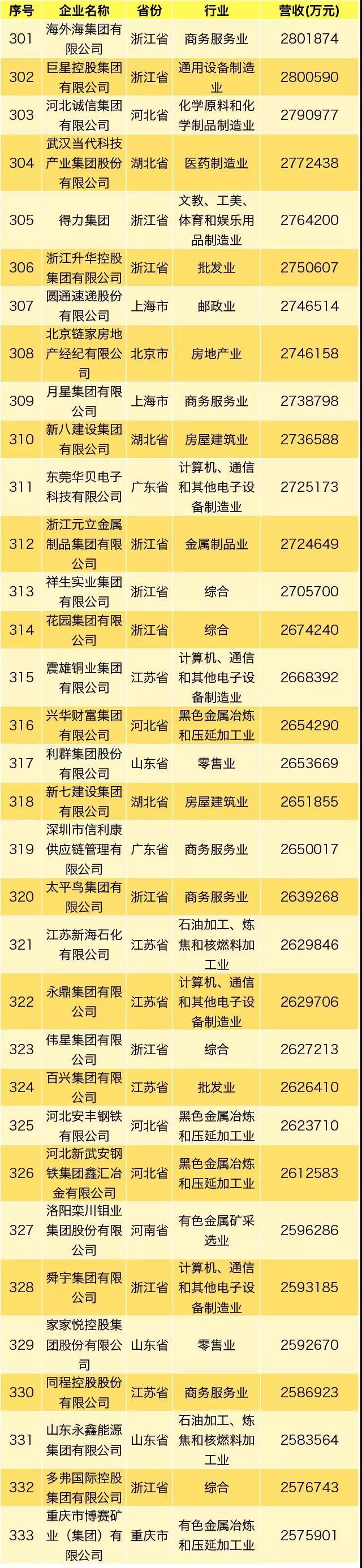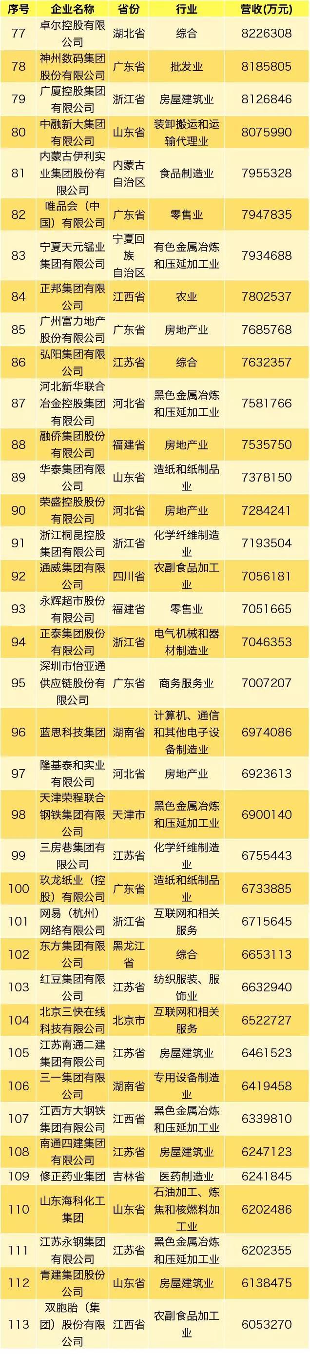 2019中國民營企業(yè)500強(qiáng)榜單中,華為投資控股有限公司以7212億營收排名第一,海航集團(tuán)、蘇寧控股分列二三位,營收額分別為6183億、6025億。正威國際集團(tuán)、恒大集團(tuán)、京東集團(tuán)、碧桂園控股、恒力集團(tuán)、聯(lián)想控股、國美控股進(jìn)入前十,永輝超市位列第93位,本次500強(qiáng)上榜門檻為185.85億。
