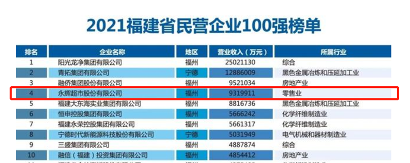 福建省企業(yè)百強榜單參照“中國企業(yè)500強”標準,是福建省經濟建設成果的重要展示。本次百強入圍門檻是35.41億元,比上年增加17.41億元,增幅接近翻倍。永輝憑借931.99億的年營收位列榜單第4名。